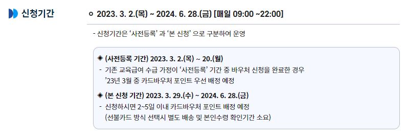 교육급여 바우처는 누리집 홈페이지에서 신청할 수 있습니다. 2023년 3월 2일부터 3월20일까지 사전등록기간이며 본등록은 23년 3월29일부터 24년 6월28일까지 신청이 가능합니다. 신청은 보호자 본인이 직접 해야 합니다. 또한, 신청 시 학생기준으로 해서 학생의 생년월일, 학교명, 학년, 교육비 등을 기입해야 하므로 미리 준비해 두는 것이 좋습니다.그런 경우 있잖아요 우리아이가 몇학년이었더라?? 미리미리 체크해 두세요 현재는 온라인을 통해서만 신청이 가능합니다